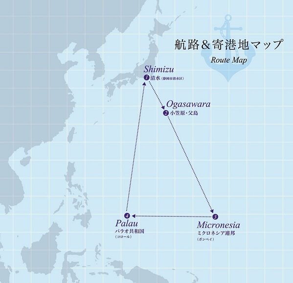 2月11日(火・祝) 清水港 出港 2月14日(金)~16日(日) 小笠原(東京都小笠原村) 2月23日(日)~25日(火) ポンペイ(ミクロネシア連邦) 3月04日(火)~07日(金) コロール(パラオ共和国) 3月14日(金) 清水港 帰港 ※天候などにより、変更となる場合があります |