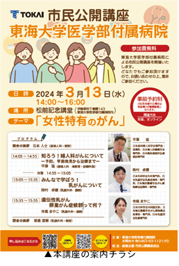 東海大学医学部付属病院では、3月13日(水)14:00より、松前記念講堂を会場に「女性特有のがん」をテーマとした市民公開講座を開講いたします。